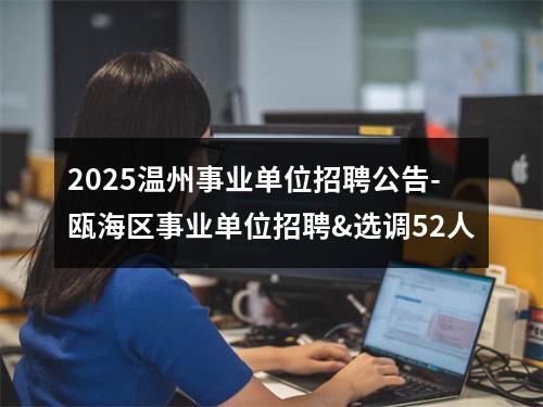 - 温州事业单位招聘信息:【2025温州事业单位招聘公告-瓯海区事业单位招聘&选调52人】具体内容见下文。